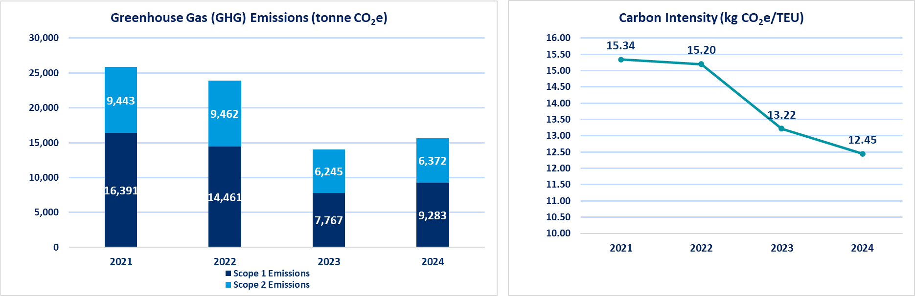 3. Carbon Intensity (kg CO2e/TEU), is the total of Scope 1 and Scope 2 GHG Emissions divided by the port’s annual throughput.